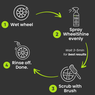 For best results, we recommend light scrubbing with a soft brush after letting the product sit for 3–5 minutes. To make it easy, we include a free wheel brush with every bottle of WheelShine — so you're ready to go right out of the box.